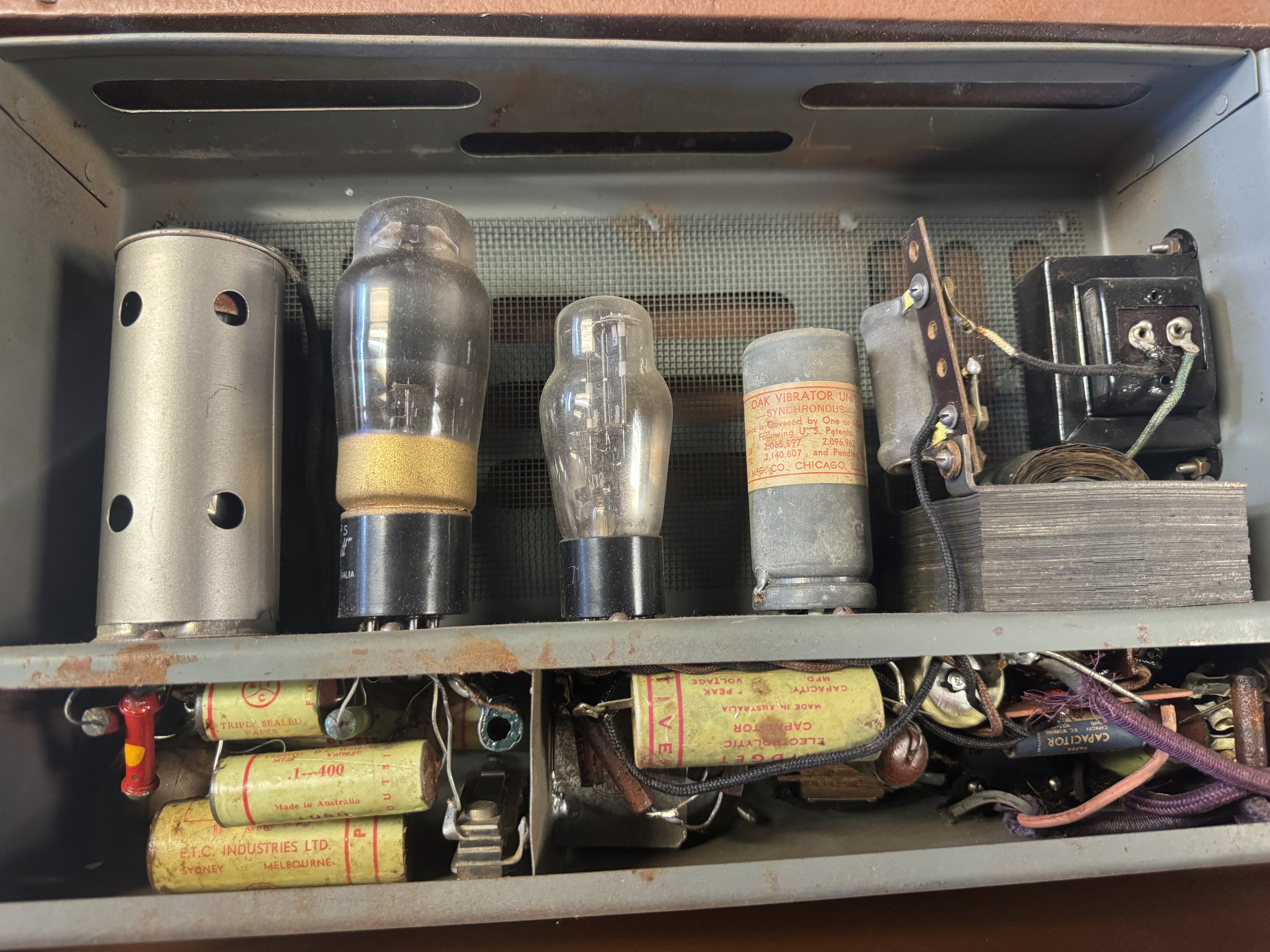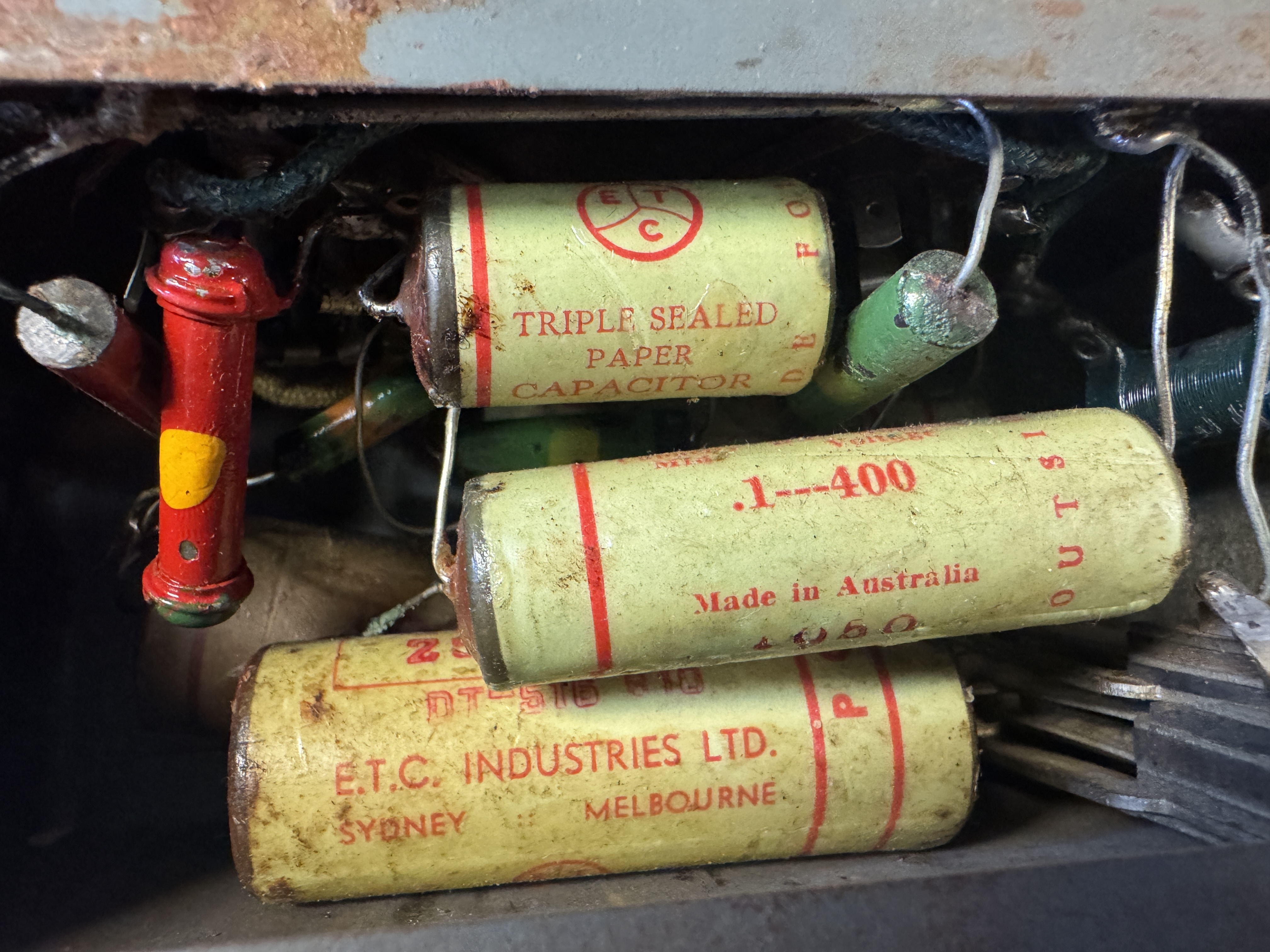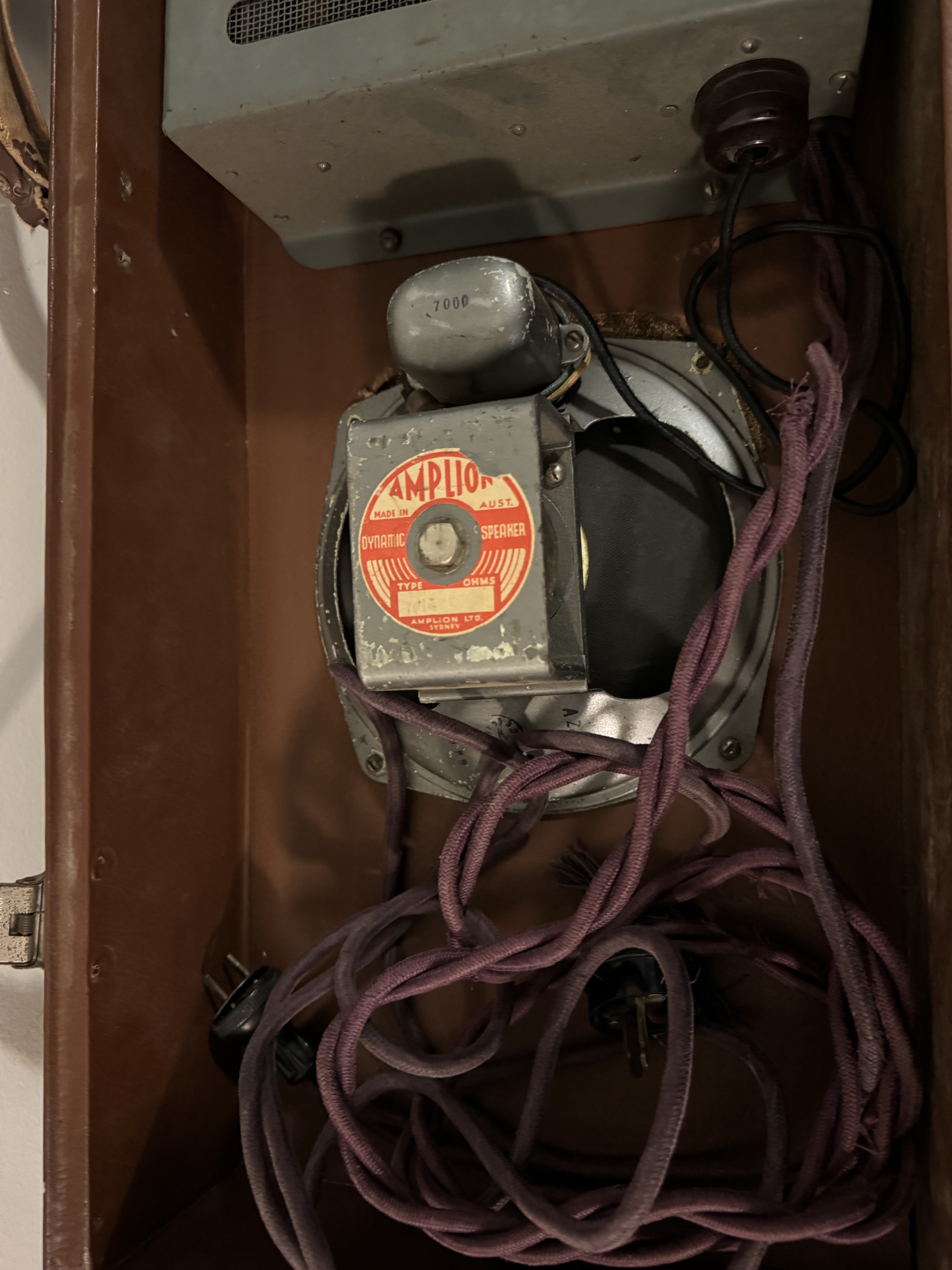 Note the loudspeaker is a wound-magnet type, sometimes called electro-dynamic, where the required magnetic field is generated by passing the HT current through the winding just visable on the top (yellow).